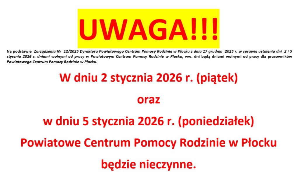 Powiatowe Centrum Pomocy Rodzinie w Płocku Aktualności 2 oraz 5 stycznia dniami wolnymi od pracy w PCPR w Płocku.